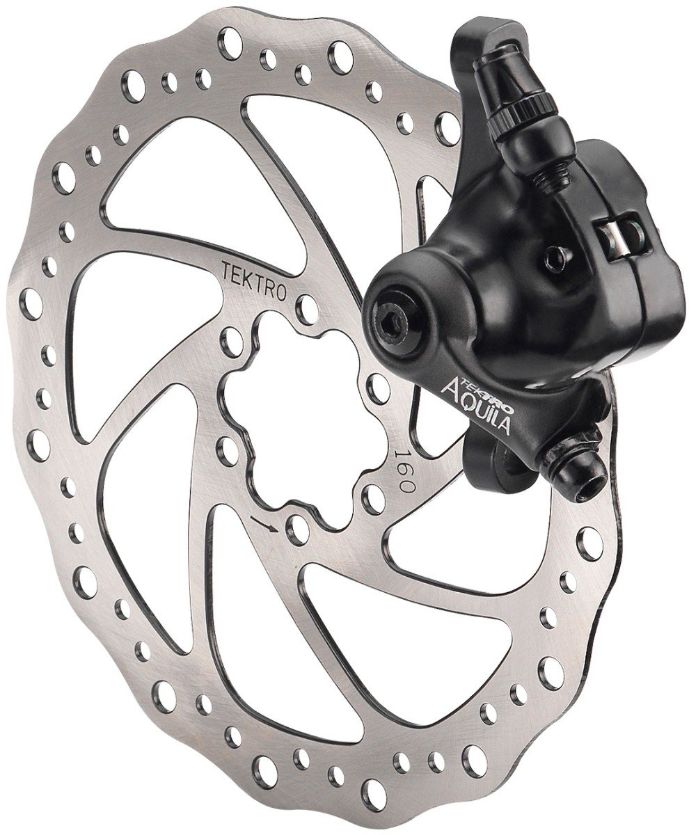 Mechanische schijfremset van Tektro bestaande uit remklauw met schijfremblokset en een remschijf met een diameter van 180 mm.